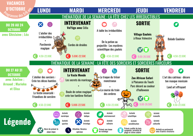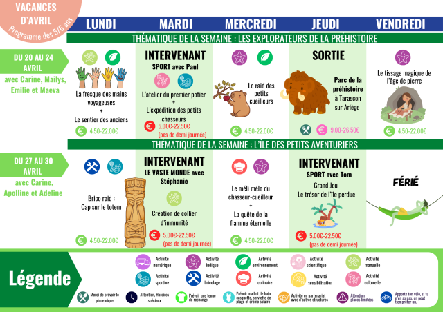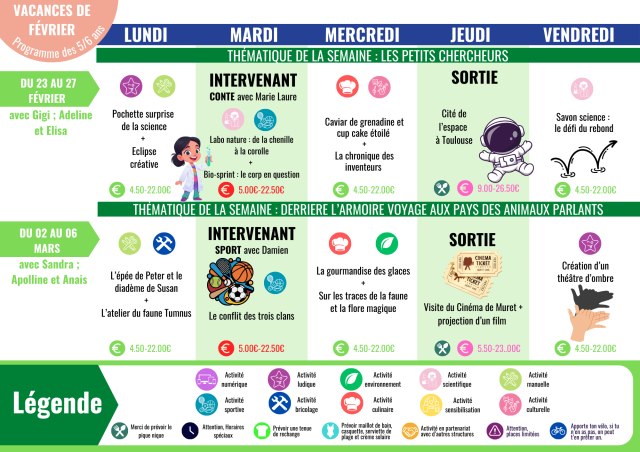 Les activités sont organisées avec des semaines à thème, des jeux, des activités manuelles, artistiques, créatives, de la découverte, de la détente, des sorties, dans le respect du rythme de l'enfant. Ce programme vous présente les animations phare de la journée.