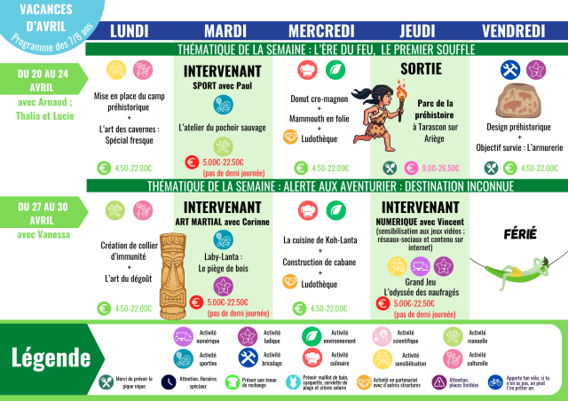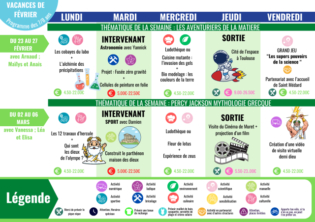 Les activités sont organisées avec des semaines à thème, des jeux, des activités manuelles, artistiques, créatives, de la découverte, de la détente, des sorties, dans le respect du rythme de l'enfant. Ce programme vous présente les animations phare de la journée.