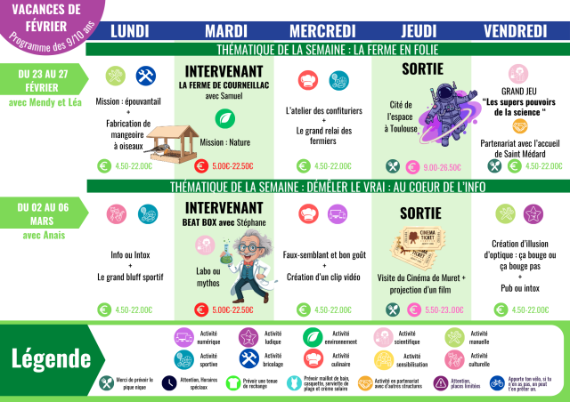 Des jeux, des énigmes, des défis, des activités sportives, créatives, de découverte, des sorties, des intervenants, des soirées, de l'échange, du rire, pour des vacances actives mais aussi relax... Ce programme vous présente les animations phare de la journée.