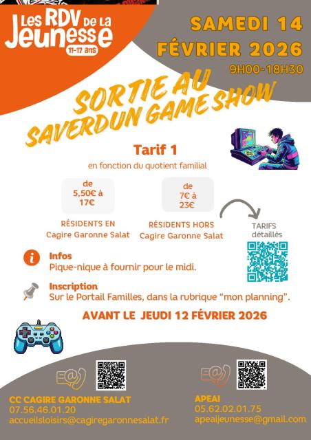 Sortie "Saverdun Game Show" samedi 14 février 2026 pour les jeunes!